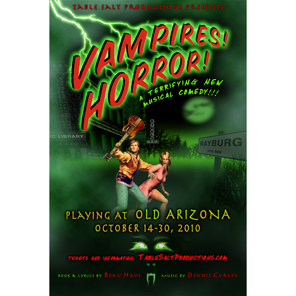 Vampires! Horror! — a brand new rock musical — is coming to the Old Arizona! With music by Dennis Curley and book and lyrics by Beau Hays, this campy show gleefully rides the blazing popularity of the Twilight series, the Anne Rice vampire books, and such television classics as Buffy the Vampire Slayer, Angel, Forever Knight, Moonlight, Being Human, The Vampire Diaries, and True Blood!